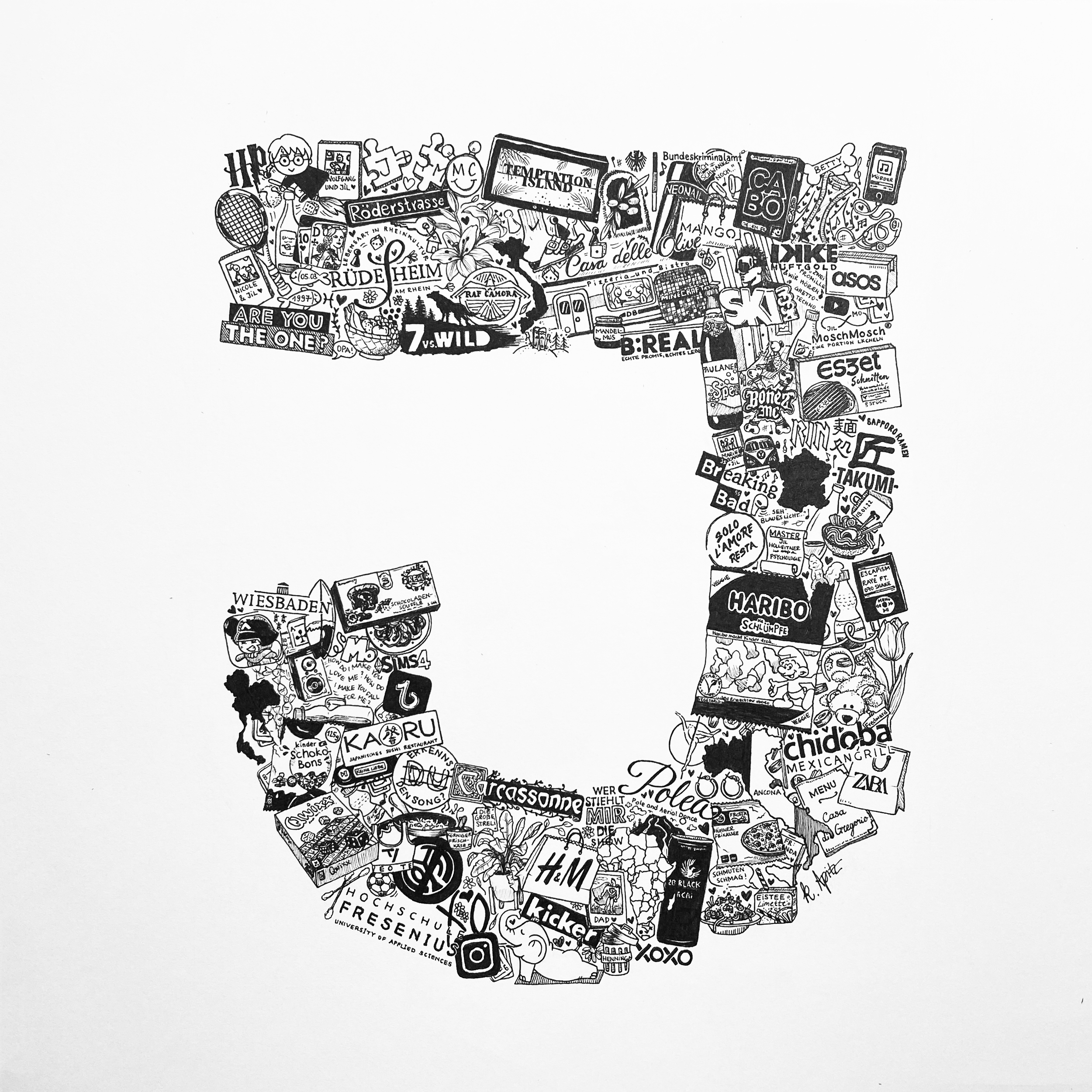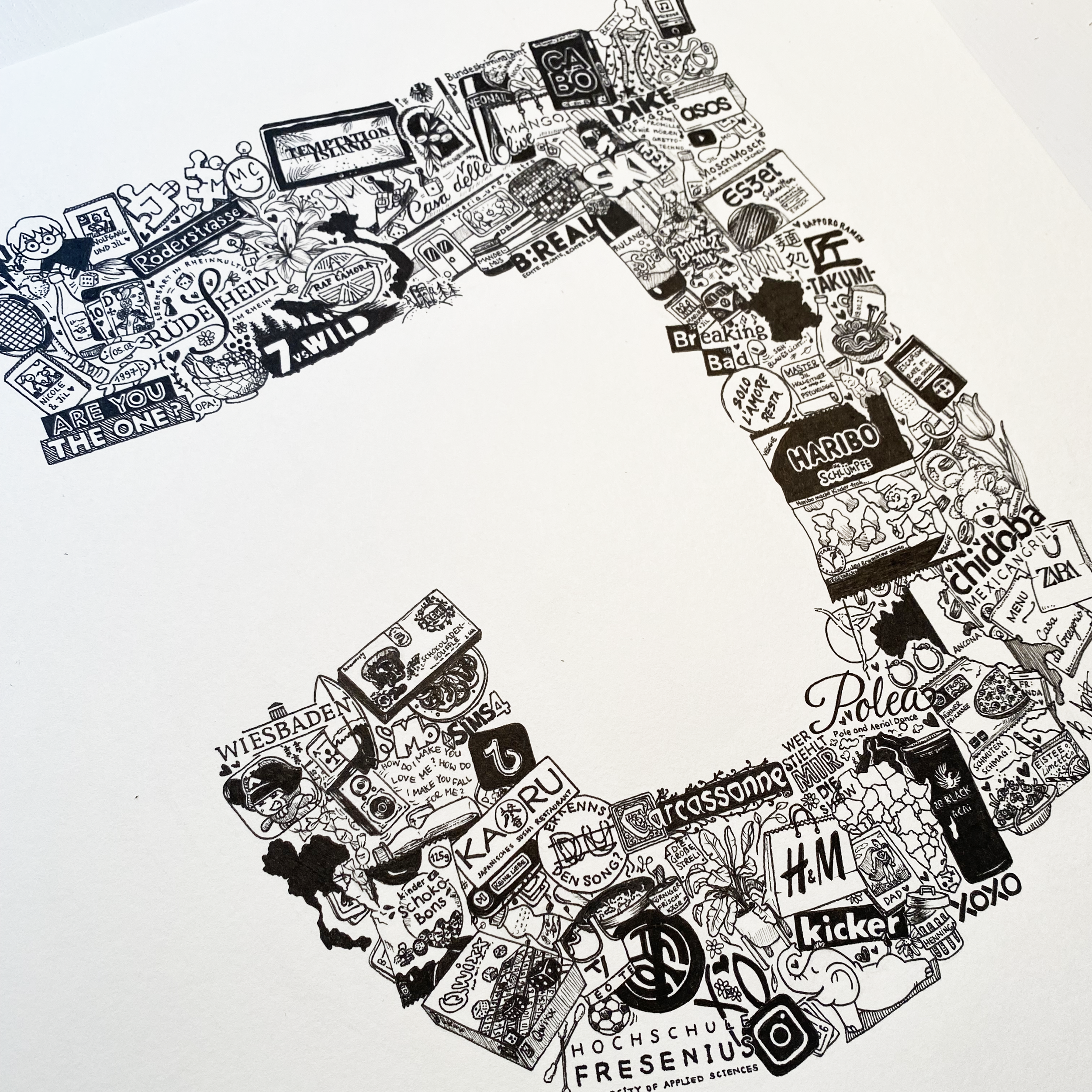Auftragsarbeit als Geburtstagsgeschenk von seiner Ehefrau. Tinte auf Papier, Format 30 cm x 30 cm